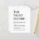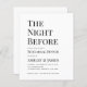 Ein einfaches, minimalistisches Dinner mit schwarz-weißer Probe. Es hat nur schwarzen Text auf weißem Hintergrund. Der Titel "The Night Before", der Anlass "Probe Dinner" und der Name sind in größeren Kappen geschrieben, die Erholung in kleinen Kappen. Der Text ist verlassen ausgerichtet.