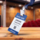 Praktisch kein Unsinn Event ID Abzeichen personalisiert mit Name, Firma, Rolle und QR Code in dunkelblau.