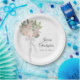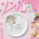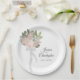 Die Teller sind in rustikalem, handgemalten Aquarellbild gehalten und mit einem Blumenstrauß in Korallentönen, Rosa, Pfirsich und Lila dekoriert. Die Rose und Blüten sind von Blätter der Eukalyptusbäume umgeben und mit einem weißen Bogen verbunden. Das elegante und dennoch schlichte boho-schicke Design umfasst die Namen des Ehepaares in extravaganter Schrift sowie das Hochzeitstag. Ideal für einen Empfang im Freien oder im Hinterhof.
