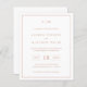Einfache, preiswerte Hochzeitseinladung mit modernem und elegantem Design mit zwei Buchstaben Monogramm oben, einem kühnen Datumslayout und Ihren Details, umgeben von einer dünnen Grenze. Alle Designelemente sind in Imitate Rose goldfarben über einem weißen Hintergrund und können im Designbearbeitungsprogramm geändert werden. Ein elegantes und stilvolles Design, das sich ideal für ein minimalistisches Paar eignet.