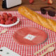 Einfache, dezente Teller aus Marmor in Orangetönen mit einem modernen Abzeichen mit weißem Quadrat, das Sie durch das Hinzufügen eines mit Monogramm Originals personalisieren können. Dies ist Teil der Cherry Tomato Red Subtle Marmor Monogram Collection.