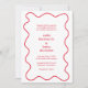 Moderne Hochzeitseinladung mit einem lustigen Design mit Ihren Veranstaltungsdetails in einem einfachen Layout in einem handgezeichneten Squiggle-Rahmen. Die Farbpalette ist rot über einem weißen Hintergrund und kann im Entwurfsbearbeitungsprogramm geändert werden. Die Bio Form des gewellten Rahmens und die kräftige und helle Farbe dieser Einladung machen es zu einer großartigen Wahl für eine moderne Hochzeit.