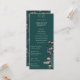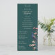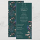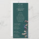 Dieses elegante und schlichte einseitige Hochzeitsprogramm zeigt rustikale, blumengeschmückte und handgezeichnet Illustrationen eines blauen und aquamarinen Pfauenvogels, der auf einem magnolischen Baumzweig in voller Blüte steht und lebendige Creme und blütige, rosa Magnolien-Blume zeigt. Die Rückseite weist ein elegantes Blumenmuster und ein Vogelmuster mit aufeinander abgestimmten Illustrationen auf, und das alles vor einem eleganten, dunkelgrünen Hintergrund. Passen Sie Ihre Hochzeitsdetails an, einschließlich Braut- und Bräutigam-Monogramm, Datum, Titel, Dienstordnung und Hochzeitsfeier.