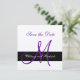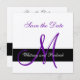 Schwarzer Streifen mit lila Initial auf einem metallischen Silberpapierstock. Einfache Save the Date Karte mit Monogrammen. Elke Clarke© Designed for the Monogram Gallery. Die Ankündigung Datum freihalten ist vollständig mit dem Stil des Schriftartes, den Farben, den Papiergrößen und dem Papierbestand anpassbar. Übereinstimmende Artikel im Geschäft. Kontaktieren Sie luxuryweddinginvitations@gmail.com für Hilfe.