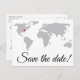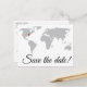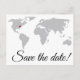 Eine einfache, Save the Date Postkarte mit einer Weltkarte auf der Vorderseite. Marker auf der Karte können verschoben werden, um den passenden Ort zu zeigen, wo die Feierlichkeiten stattfinden!