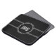 Sie können das silberne Monogramm, das sich in der Mitte dieses schwarzen Laptop-Ärmels befindet, personalisieren. Der Text befindet sich in einem schwarzen Kreis, der eine doppelte Grenze hat. Die Grenzen des Kreises sind silber. Vier Silber-Linien gehen über den Ärmel.