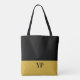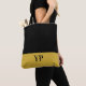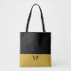 Eine goldene Band befindet sich am Ende dieser schwarzen und goldenen Tottasche. Personalisieren Sie Ihre Initialen.