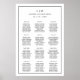 Einfache Hochzeitssitzplakette mit modernem, elegantem Design mit zwei Buchstaben Monogramm, Namen und Datum mit der Grafik unten, umgeben von einem dünnen Rand. Das Template besteht aus drei Säulen mit zwölf achtköpfigen Tischen, die jedoch an Ihre Anzahl von Tischen und Gästen angepasst werden können. Ein elegantes und stilvolles Schwarz-Weiß-Design, das sich perfekt für ein minimalistisches Paar eignet.