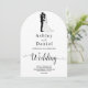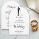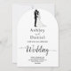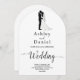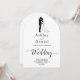Diese elegante Schwarzweiß-Bogenhochzeit lädt zu einer modernen Hochzeit ein. Das einfache Design zeichnet sich durch eine elegante schwarze Kalligraphie und eine Braut- und Bräutigam-Illustration auf einem sauberen, weißen Hintergrund aus. Die Einladungskarte enthält die Hochzeitsdetails auf der Rückseite, anstatt für eine separate Kapselkarte zu bezahlen.