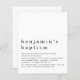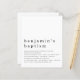Budget Einfache Schwarz-weiße Mädchen oder Junge Taufe. Eine preisgünstige SMALLER 4.5" x 5.6" Alternative. Erhältlich in einem SEMI GLOSS 110lb CARD STOCK oder einem SATIN FINISH 80lb THINNER PAPIERSTOCK. Umschläge sind optional. Der Header ist groß in stilvollen Kleinbuchstaben mit den Details unten. Viel Weiß an der Spitze für ein zeitgenössisches Ambiente! Personalisieren Sie den Text einfach auf Ihre eigenen Daten.