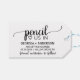 Dieses schlichte schwarze Kalligrafie "Bleistift in" Save the Date ist perfekt für eine rustikale Hochzeit. Das ist eine so niedliche Idee für eine Alternative Save the Date. Benutzen Sie den beiliegenden Zwirn, um den Anhänger an einen kleinen Bleistift anzuhängen, und schicken Sie ihn an Ihre Hochzeitsliste. Bleistift nicht enthalten.