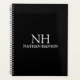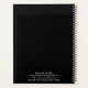 Moderner Businessplaner mit einem einfachen und minimalen Schwarz-Design mit Ihrem Monogramm in einem fetten Schriftart zusammen mit Ihrem Namen auf der Vorderseite. Auf der Rückseite finden Sie Ihre Kontaktdaten.