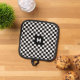 Dieser schwarz-weiße Pothalter hat ein Schachbrettmuster. Es gibt auch einen ersten in der Mitte. Sie können den Buchstaben in das richtige Monogramm ändern.
