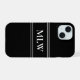 Dieses schwarze iPhone Gehäuse hat drei weiße Buchstaben in der Mitte. Sie können die Buchstaben ändern, um das richtige Monogramm anzuzeigen. Zwei weiße horizontale Linien liegen über und unter den Initialen.