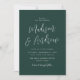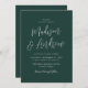 Minimalistische Einladungen für Hochzeiten mit Ihren Namen, die in einem einfachen weißen Skript mit Ihren Hochzeitsdetails angezeigt werden, unten auf einem waldgrünen Hintergrund. Die Einladung kehrt zu einem soliden Waldgrün-Hintergrund mit Platz für Text und Fotos zurück.