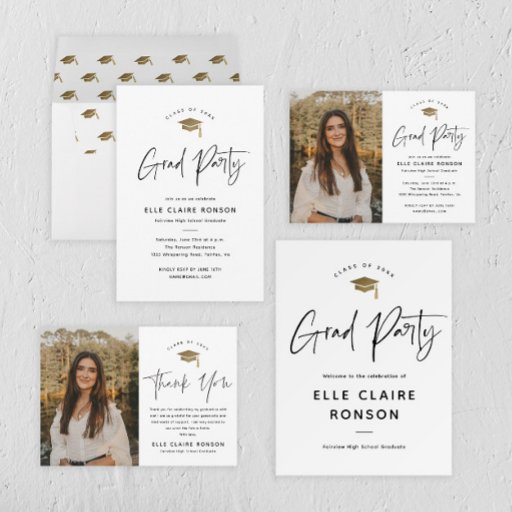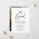 Einfache Script Schwarz und Weiß Foto Abschluss Ankündigung mit eleganten goldenen Folienkappe und minimalistische Typografie. Klicken Sie auf die Schaltfläche Bearbeiten, um dieses Design anzupassen. Fügen Sie einfach ein Foto auf die Rückseite.