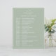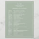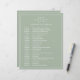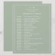 Einfache Wedding Timeline mit einem modernen, aber eleganten Design mit Ihren zwei Buchstaben Monogramm an der Spitze und Ihre Details umgeben von einem dünnen Rand. Der gesamte Text ist weiß über einen sage-grünen Hintergrund und kann durch Anklicken des Buttons "Anpassen" in beliebige Farben geändert werden. Ein elegantes und stilvolles Design, das sich ideal für ein minimalistisches Paar eignet.