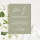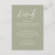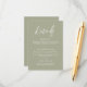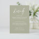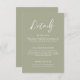 Unsere schlichte weise grüne Hochzeitskarte ist ideal für Ihre elegante Hochzeit, um wichtige Informationen als separates Insert zu enthalten. Eine schöne Verbindung von weißem Kalligraphie-Schriftart mit schlichtem und sauberem Text auf sanftem grünem Hintergrund sorgt für einen erhöhten Look, der Ihr stilvolles Ereignis ergänzt. Einfach und schnell, um sich mit Details Ihres Empfangs, Geschenke, Unterkunft und/oder andere Details, die Sie für Ihre Hochzeit benötigen, zu individualisieren.