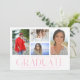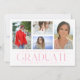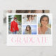 Die Simple Script Multi Foto Abschluss Announcement Card beinhaltet vier Ihrer Lieblings-Fotos Ihrer Uni oder High School Absolventen mit dem eleganten, modernen rosa Kalligraphieskript "Graduate" Overlay. Fügen Sie auf der Rückseite ein zusätzliches Foto hinzu. Einfach, stilvoll und elegant. Erstellt von ©Evco Studio www.zazzle.com/store/evcostudio