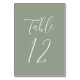Elegante Hochzeitsszenarien mit der Tischnummer, die in einem einfachen, weißen Skript mit einem sage-grünen Hintergrund angezeigt wird. Die Text- und Hintergrundfarben können mithilfe der Editierwerkzeuge auf Ihre Hochzeitsfarben geändert werden. Um diese Tischkarten zu bestellen, editieren Sie die Karte individuell mit der Nummer und fügen Sie sie Ihrem Warenkorb hinzu. Wiederholen Sie den Vorgang für jede benötigte Nummer.