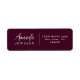 Ein einfaches und stilvolles Design auf dunkelrotem Hintergrund mit einem modernen, kursiven, handgeschriebenen Namen und einer serifenlosen Adresse.