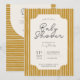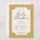 Minimalistische Babydusche lädt zu einem vertikalen Streifen Hintergrund ein. Set in Senffarben Gelb, Beige und Dunkelblau. Passen Sie den Text und den Schriftart, die Skalierung des Musters und die Farbe der Form an, die sich unter dem Text befindet. Eine tolle Option für Babydusche, geschlechtsneutrale Babydusche, Einladungen zur Babydusche und boho-Babydusche.