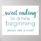 Luxuriös türkisblau, aquamarinblau, seafoam und weiß horizontal "Sweet Ending to New Beginning" Dusche, Party oder Empfang Tafel mit einem lustigen, lässigen handgeschriebenen Drehbuch. Das klassische Design beinhaltet ein modernes, handhabbares Offerttipografie-Overlay. Der hübsche Schriftart mit einer individuell anpassbaren Hintergrundfarbe macht es einfach, sich jedem Thema anzupassen. Für andere Farben oder passende Produkte, besuchen Sie bitte den JustFharryn Zazzle Store, oder kontaktieren Sie den Designer, c/o fharryn@yahoo.com Alle Rechte vorbehalten. #zazzlemade