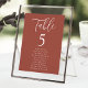 Modernes Hochzeitssitzdiagramm mit "Table", das in einem weißen Skript mit der unten abgebildeten Tischnummer und den Gästennamen auf Rosthintergrund angezeigt wird. Das Design wiederholt sich auf der Rückseite. Um das Sitzdiagramm der Tischnummer zu bestellen, editieren Sie jede Karte mit der Tischnummer und den Namen der Gäste und fügen Sie es Ihrem Warenkorb hinzu. Entworfen, um mit unserer Simple Script Hochzeitskollektion zu koordinieren.