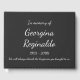 Dieses einfache und elegante Begräbnis- oder Gedenkbuch mit dunkelgrauem Hintergrund und Text in weißem Schrift. Es enthält einen personalisierten Namen, Geburts-/Todesjahre und eine angepasste Nachricht.