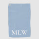 Drei weiße Buchstaben sind unten. Sie können die Buchstaben ändern, um das richtige Monogramm anzuzeigen. Dieses mit Monogramm Golfhandtuch ist Baby blau.