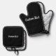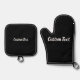 Dieses schwarze Ofen Mitt und Pothalter Set hat Text in weißem Schrift. Text kann bearbeitet oder gelöscht werden.