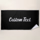 Dieses schwarze Strandtuch hat ein weißes Skript als Display-Text. Sie können es bearbeiten, um personalisierten Text zu zeigen.