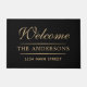Modernes und elegantes Haus. Dieses Design enthält den Text "Welcome" in der Kalligraphie-Schrift mit Nachname , der Zuhause-Adresse und den einfachen horizontalen Trennlinien-Akzenten.