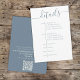 Die Timeline-Einschließungskarte mit einem dustigen blauen Farbschema bietet moderne Hochzeitsdetails, eine einfache Zeitleiste mit staubblauem Lichteinfall, einen stilvollen, trendigen Kalligraphie-Skripttext mit QR-Code-uAwg-Website online, eine Website für Hochzeitsgast-Antworten, weitere Informationen Info-URL, ein einfaches minimalistisches minimalistisches Design, eine einfache, klassische typografische Webadresse, ein Gästedles und informatives Internet, Einladende Informationen und Einladende Einladungs-Einladungskarten-Einladungs-Eintrittskarte