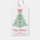 Modernes Weihnachtsgeschenk-Tag mit einem einfachen und niedlichen Doodle eines Weihnachtsbaumes mit einem Bogen zusammen mit dem bearbeitbaren Gruß "Frohe Weihnachten" und Ihrem Namen.