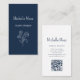 QR-Code Navy Blue Botanical Blumen-Visitenkarte, mit einem einfachen, daisy Design. Mit anpassbaren weißen und marineblauen Schriftzeichen können Sie Ihre eigenen Informationen hinzufügen. Sie fügen Ihre Website dem QR-Code-Feld hinzu, damit Ihre Kunden scannen können. Ideal, um Ihr Design-Geschäft mit einem beruflichen und femininen Stil zu fördern.