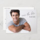 Hier ist eine einfache Save the Date-Postkarte, die einen großen Einfluss hat. Dunkelgrau-Schrift auf der rechten Vorderseite verbindet sich mit Ihrem eigenen Foto und dem benutzerdefinierten Datum. Auf der Rückseite befinden sich viele Textfelder, um Ihre Informationen zu vermitteln. Modern, trendig und einfach zu anpassen!