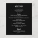 Ein schwarzes Dinner-Menü mit schicken weißen Schriftzeichen. Ideal für einen modernen Hochzeitsempfang, ein Hochzeitsdinner, ein Jubiläum-Party oder ein besonderes Probe mit einem Dinner. Ein ausgezeichneter Wert, gedruckt auf 80lb Gewicht unbeschichtetes, mattes Weißpapier mit einem Gewicht von 4,5" x 5,6", aber Sie können aus 3 Papiergrößen für Ihr Menü wählen.