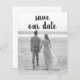 Budget Save the Date mit dem vollen blutenden vertikalen Foto und einem Textüberlagern mit den Worten: "rett unser Datum" in einer schwarzen Schrift oben. Im unteren Teil sind Ihre Namen und das Datum. Die Rückseite hat Ihre Hochzeitsdetails in schwarz-weiß. Ein einfaches und modernes Design, das Ihr Foto zum Hauptmerkmal macht.