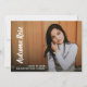 Moderne Abschluss-Ankündigungskarte mit mehreren Fotos. Die Vorderseite hat den Namen des Absolventen in fett weißer Schrift senkrecht entlang der links Seite mit dem Klassenjahr und Schulname am unteren Ende, über Ihrem LieblingsFoto. Die Rückseite hat eine Collage mit drei Fotos auf weißem Hintergrund. Der Hintergrund kann in eine beliebige Farbe geändert werden. Diese Ankündigungskarte ist ideal für ein Mädchen mit High School Abitur.