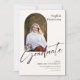 Diese 5" x 7" Abschluss-Ankündigung mit einem bogenförmigen Foto auf Elfenbeinhintergrund mit schwarzer Schrift. Zu den Teilnehmern zählen der Name des Absolventen, die Uni oder der Universitätsname, der Grad, der Schwerpunkt des Abschlusses und eine zusätzliche Zeile für weitere Informationen wie z.B. Sonderehren.