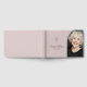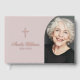 Gedächtliches Begräbnisguestbook mit einem Foto in einem Halbbogen und einem einfachen Christlichen Kreuz.