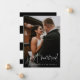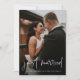 Nur verheiratet! Mit dieser einfachen und modernen Foto-Flachkarte können Sie Ihre Hochzeit bei Familie und Freunden verkünden. Es verfügt über ein weißes, handgeschriebenes Skript-Overlay mit schwarz-weißen Streifen. Personalisieren Sie diese durch Hinzufügen von Namen, Datum, Ort und Foto.