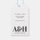 Einfache, elegante Minimalistisch-Chic-Tags für Hochzeiten, die perfekte Touch für Ihre Hochzeitsempfangstaschen oder Hochzeiten in Urlaubsort! Diese personalisierten Dankeschön-Tags zeichnen sich durch ein elegantes Schwarz-Weiß-Design mit individuell anpassbaren Braut- und Bräutigam-Initialen aus, das Ihre Hochzeitsdekoration mit einer Touch von Eleganz ergänzt. Unsere mit Liebe zum Detail gestalteten Geschenketiketten können mit dem Namen, dem Foto des Empfängers und einer persönlichen Dankesbotschaft personalisiert werden, was sie zu einem wahrhaft unvergesslichen Sake für Ihre Gäste macht. Diese einfachen, aber stilvollen Geschenketiketten sind mit einem Front- und Backdesign vielseitig genug, um jedes Hochzeitsthema oder Farbschema zu ergänzen. Egal ob Sie eine Schwarz-Weiß-Hochzeit veranstalten oder einfach nur minimalistische Eleganz schätzen, unsere Geschenktags von Wedding Monogram werden Ihre Gäste beeindrucken und einen bleibenden Eindruck von Ihrem besonderen Tag verlassen.