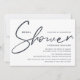 Einfache minimale moderne Drehschrift "Dusche" mit massivem dunkelblau-grau und Wildblume in einem Glas in Weiß auf der Rückseite der Einladung. Melde mich, wenn du Hilfe brauchst oder spezielle Wünsche hast.