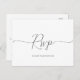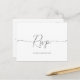 Einfache Minimalistische Hochzeit RSVP Postkarte. Personalisieren Sie den benutzerdefinierten Text oben. Weitere Koordinationsgegenstände finden Sie in unserer Kollektion "Simple Minimal Script Black & White Wedding". ***BITTE BEACHTEN SIE: ALLE WORTE, TEXT UND HINTERGRUNDFARBE SIND ERFORDERLICH. Sie können alle Wörter ändern und auch die Textfarbe ändern. Bei Elementen mit farbigem Hintergrund können Sie auch die Farbe so ändern, dass sie dem Text entspricht. Klicken Sie einfach auf "Entwurfswerkzeug bearbeiten", um Änderungen vorzunehmen.