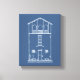 Tiny House Blue & White Blueprint Stil Zeichnend Canvas Print. Dieses Bild ist aus meiner originalen Tinte auf der Mylarhand gezeichnet von einer kleinen rustikalen Hütte mit charmanten architektonischen Details und kleinen Steinbänken auf jeder Seite der Tür. Ich änderte das Bild digital, um wie ein antiker oder Vintager Entwurf zeichnend auszusehen (Anfang bis Mitte des 20. Jahrhunderts).