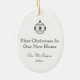 Neue Zuhause-Tinte, die neues Zuhause-erstes Schwarzweiss-Weihnachtsdoppelseitige ovale Keramik-Verzierung zeichnet. Behalten Sie das Zeichnen des Hauses auf Front oder laden Sie Ihr eigenes Bild. Aller Text an kann zurück besonders angefertigt werden. Dieses Bild ist von meiner ursprünglichen Tinte auf Plastik-Handdem zeichnen einer kleinen rustikalen Hütte mit dem Bezaubern der Architekturdetails und kleiner Stein benches jede Seite der Tür.