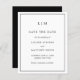 Einfaches Budget Save the Date mit modernem und dennoch elegantem Design mit Ihrem zweistelligen Monogramm oben und Ihren Hochzeitsdetails, umgeben von einer dünnen Grenze. Alle Designelemente sind schwarz und weiß und können im Entwurfsbearbeitungstool geändert werden. Ein elegantes und stilvolles Design, das sich ideal für ein minimalistisches Paar eignet.