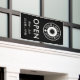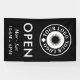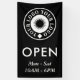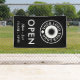 Offen für geschäftliche Outdoor-Banner in schwarz können Sie mit Ihrem Business-Logo personalisieren. Öffnen Sie unter sich in großen weißen Buchstaben. Offenes Banner für den Einsatz im Freien personalisiert mit Ihrem kleinen Firmenlogo und Ihren Öffnungszeiten.